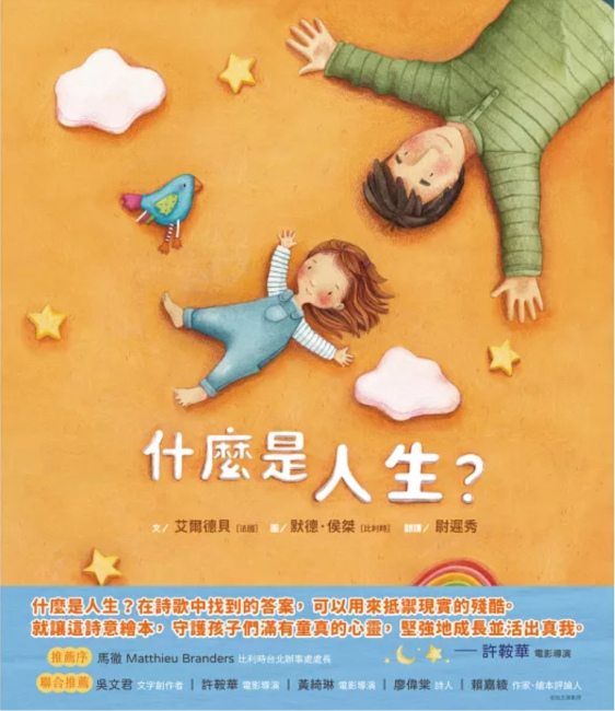 《什麼是人生?》則源於她和孩子們太喜歡這首歌了,於是她再度「主動出擊」,詢問作詞者艾爾德貝(Aldebert)可否讓她畫成繪本,為這首旋律輕快、內容雋永,在法語圈膾炙人口的兒歌,催生了精美的繪本。