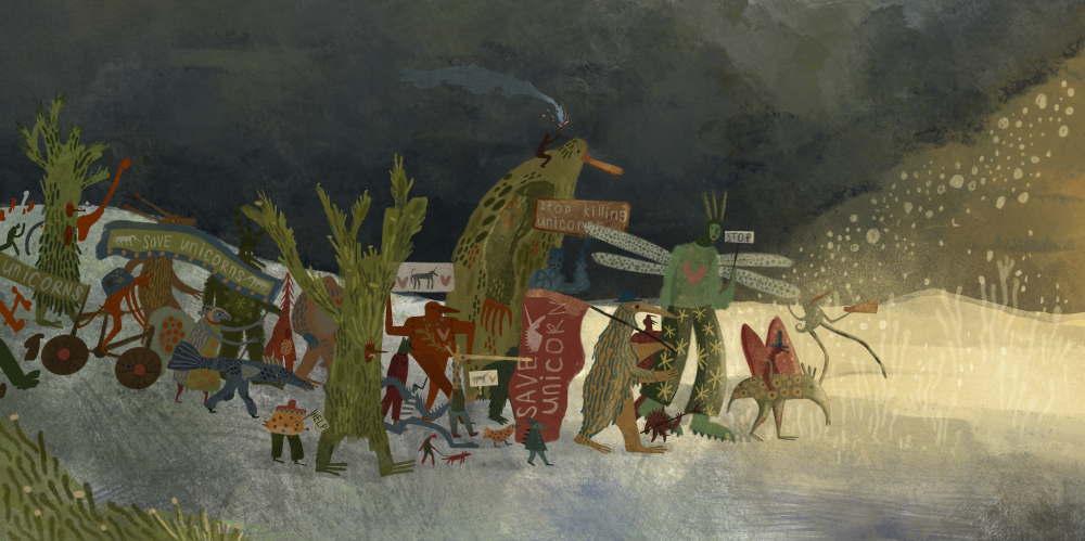 今年,波隆那兒童書展SM基金會國際插畫獎(BCBF/Fundación SM)授予烏克蘭藝術家Maria Haiduk。她出生於赫爾松,作品《弒神》(Killing Gods)探討生態滅絕及人類與自然的關係,「我的作品與人類盲目消耗地球資源的時代有關,我真誠希望有助於引起更多人關注人類對自然和動物犯下的種族滅絕問題。」