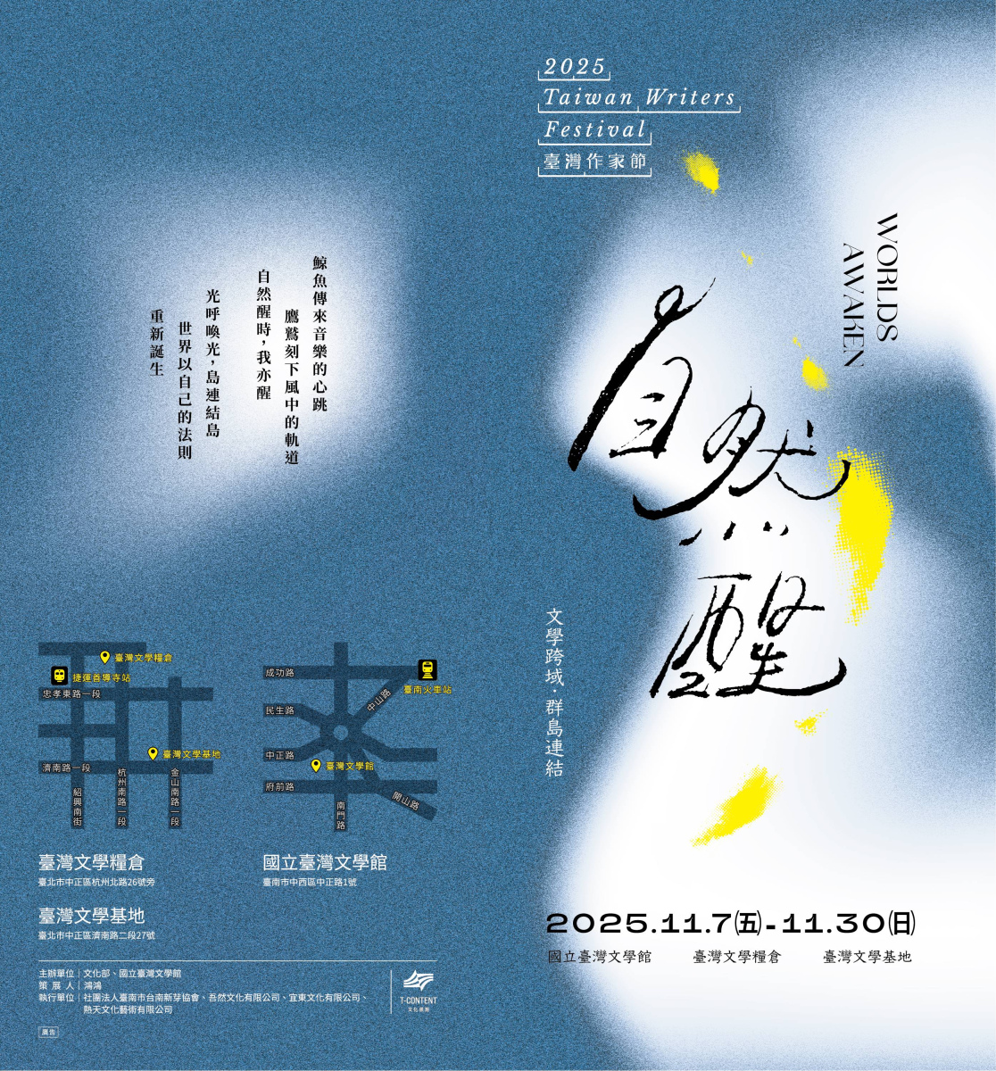 扣合年度主題,臺灣作家節邀請陳思宏、吳明益、零雨3位焦點作家,以作品分別展現覺醒的不同層次,包含陳思宏以同志視角書寫新鄉土文學,從個人經驗出發,呈現自我意識的覺醒;吳明益以自然書寫與環境寓言,喚起人與自然之間的共感與甦醒;零雨則以詩為形式,凝視自然與歷史,展現文學對現實的回應與省思。活動期望邀請觀眾與作家交流對話,在臺灣文學內容中的語言、環境、族群的多元生態中覺醒。