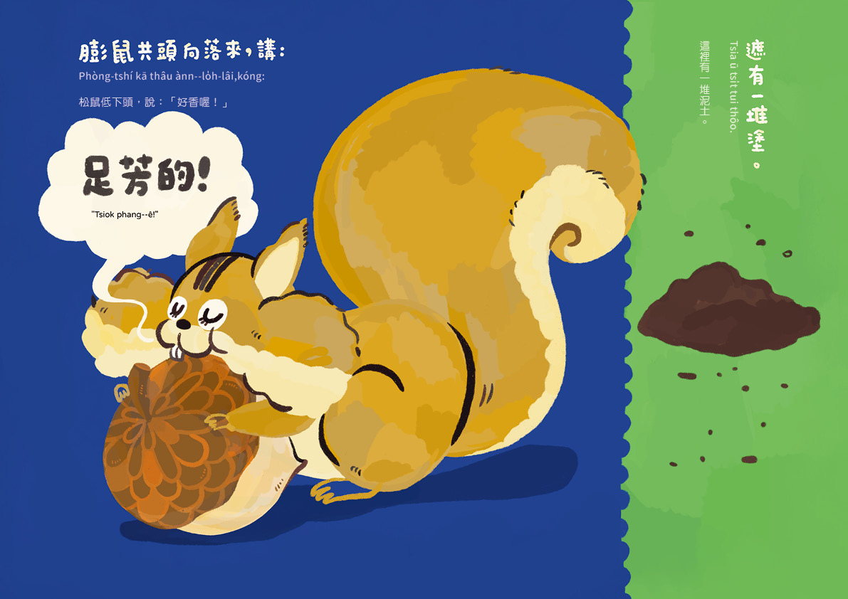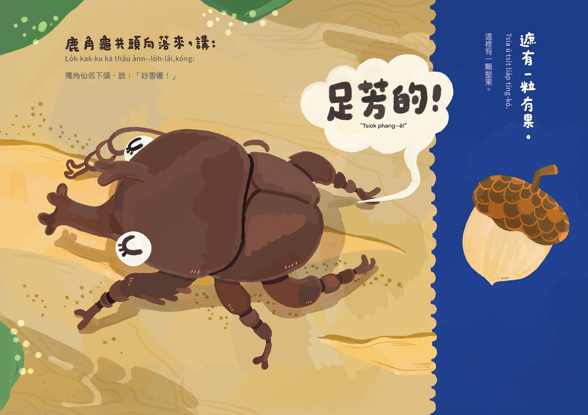 《足芳的》書中的「一」都很重要喔!「一片」草地、「一顆」堅果、「一朵」花、「一堆」泥土、「一條」小溪……這些「一」後面接的量詞或是單位詞,在朗讀的過程中,自然地進入孩子的耳中,成為語言的養分,之後能順暢自然的運用。還有那些對大人來說,轉換為台語發音可能也需要思考一陣子的名詞:乳牛、獨角仙、堅果,朗讀起來有挑戰也有學習。