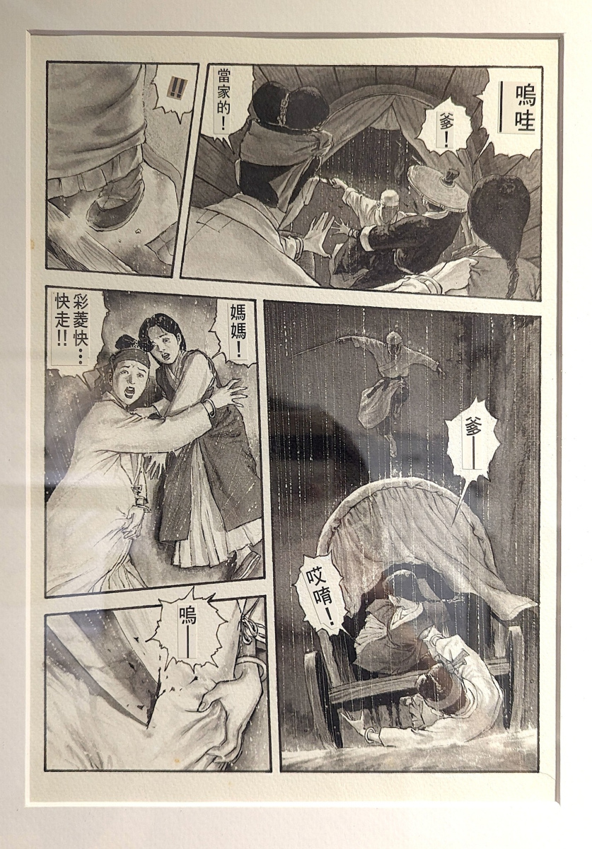 第三面展牆上,一組雨夜裡賊人劫車的原稿,以精至毫巔的墨色配置,披露出了造型能力之外,真正促使寫實、寫意同步運作的關鍵,在於黑、白、灰交互構築的虛實編碼。就像畫格裡的雨絲其實來自刀片刮去圖像後的空白,視覺前提下,「內容」成立與否,多數時候取決於觀看者眼中的有無,而不是客觀視角下的真偽。這或許也說明了,創作者、讀者本是共同追求體驗的夥伴。只要其中一方不願意尋找共識,彼此便不可能在終點相遇。