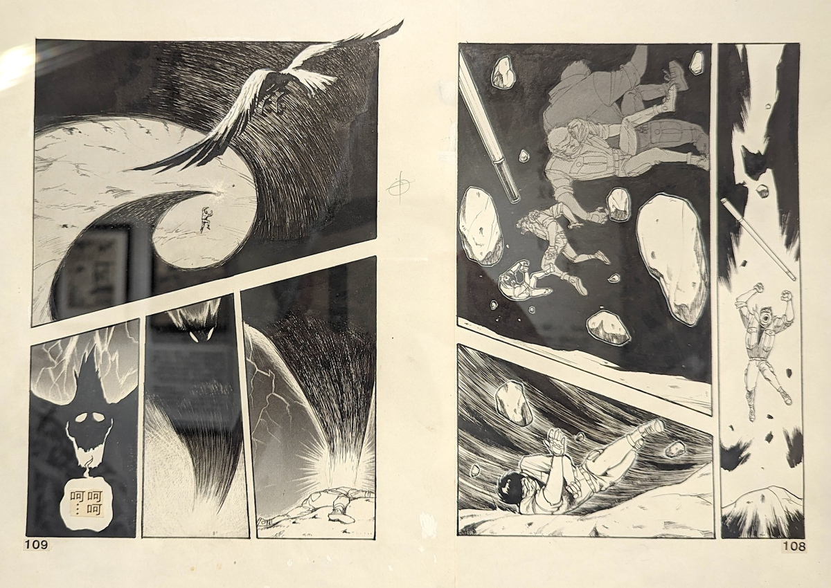 展出牆面上,一組合計2頁的原稿,演繹了悟空因雷擊而縮小、倒地之後,如來法師以黑影之姿旋入場中、現身邪笑的光景。從呼應落雷動態的窄長畫面,到斜切底邊、頂邊烘托出的時間感及方向性,這7個畫格,說明了創作者如何利用間距(間白)安排資訊段落,如何借助框格的尺寸、形狀及佔比,引導讀者順利觸及意涵,產生思緒及感受。相比之下,另一組表現悟空遇襲時召喚筋斗雲、及時騰空避過的內容,則明顯加大了跨度,需要讀者投入更多補間想像。