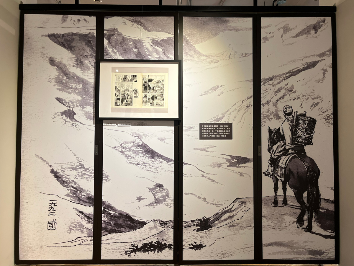 從《一刀傳》展區的尾端轉身,能看見《赤狐》故事中壯麗的山巒。這雖然不是一部完整連載的作品,只在1995年的《High都市漫畫休閒誌》月刊上發表了少量內容,但極致精密的製圖筆法,卻有如徹底反思「漫畫」的視覺本質,不只解構了它簡筆化、線條化的符號傳統,也對日式作品延伸的表現體系提出新議。