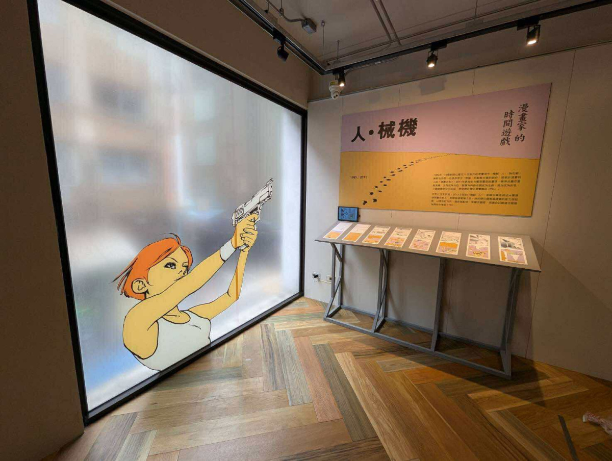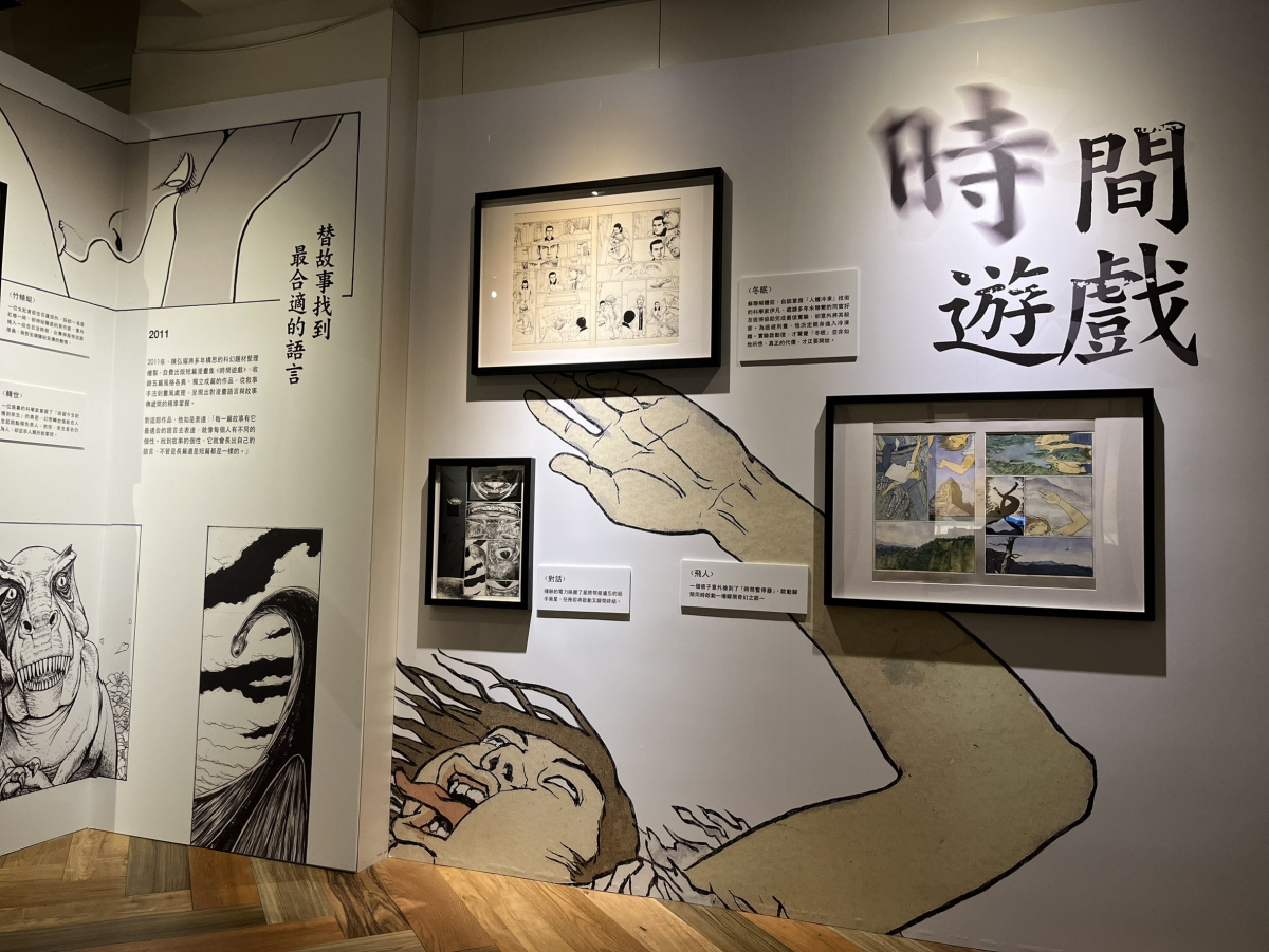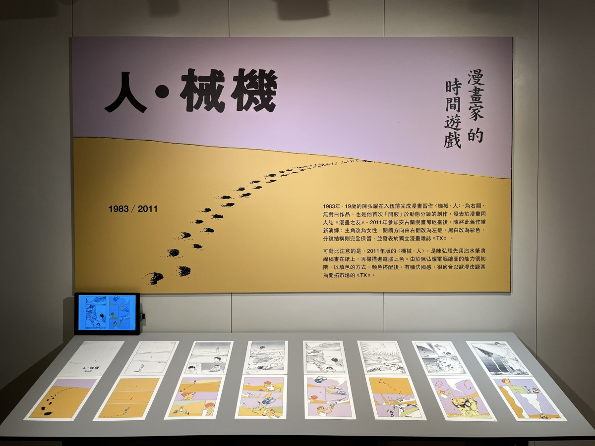 最後一個展區,是2011年自費出版的《時間遊戲》,短篇作品《機械.人》的新舊版本比較,以及設計類、插畫類作品的綜覽。作為短篇創作集,包括曾發表於臺灣獨立漫畫期刊《Taiwan comiX》的作品在內,《時間遊戲》裡的5篇故事,轉換了5種截然不同的圖像風貌。從繁簡筆法的極端對映到細節筆觸的集中刻劃,從面狀填色的灰白敘事、線性紋理的寫實成像,到精準變形的彩畫展演。其間技法跨度之大,不僅使人無從察覺它們出自同一人手筆,也帶出了耐人尋味的疑問:為什麼,一位入行30年,幾乎自在駕馭東、西方漫畫形式的創作者,會在觸及兼容寫實與寫意的表現體系之後,轉而投入「不拘一格」的發展方式呢?