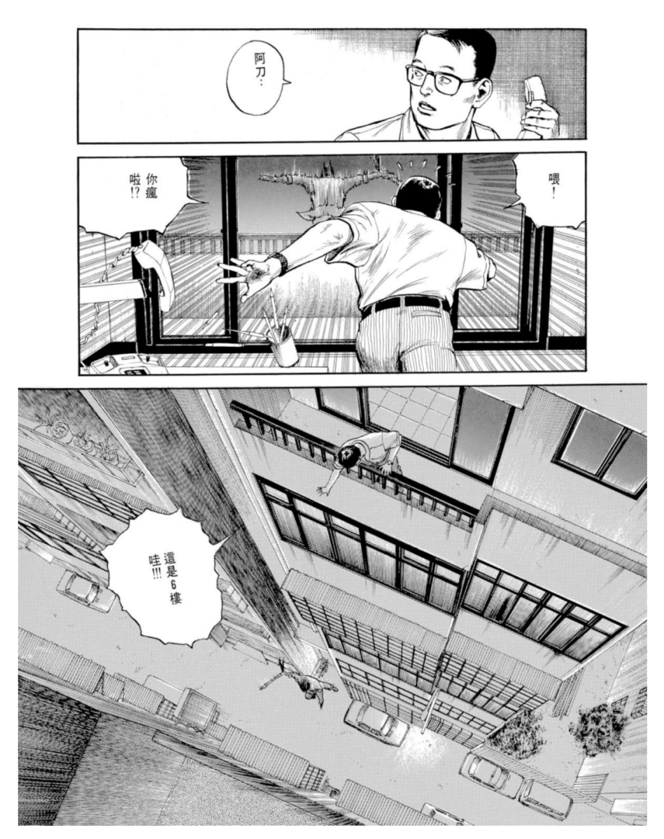 這種對於技法原理的掌握,使得《一刀傳》不只令讀者「閱讀」,更帶來一定程度的沉浸體驗。無論能否以「電影感」一詞統稱,這些隱藏在具體畫面中的抽象知覺,或許才是畫技之外,真正令角色在舞刀、登樹、縱身、躍車時,總能栩栩如生的原因。
