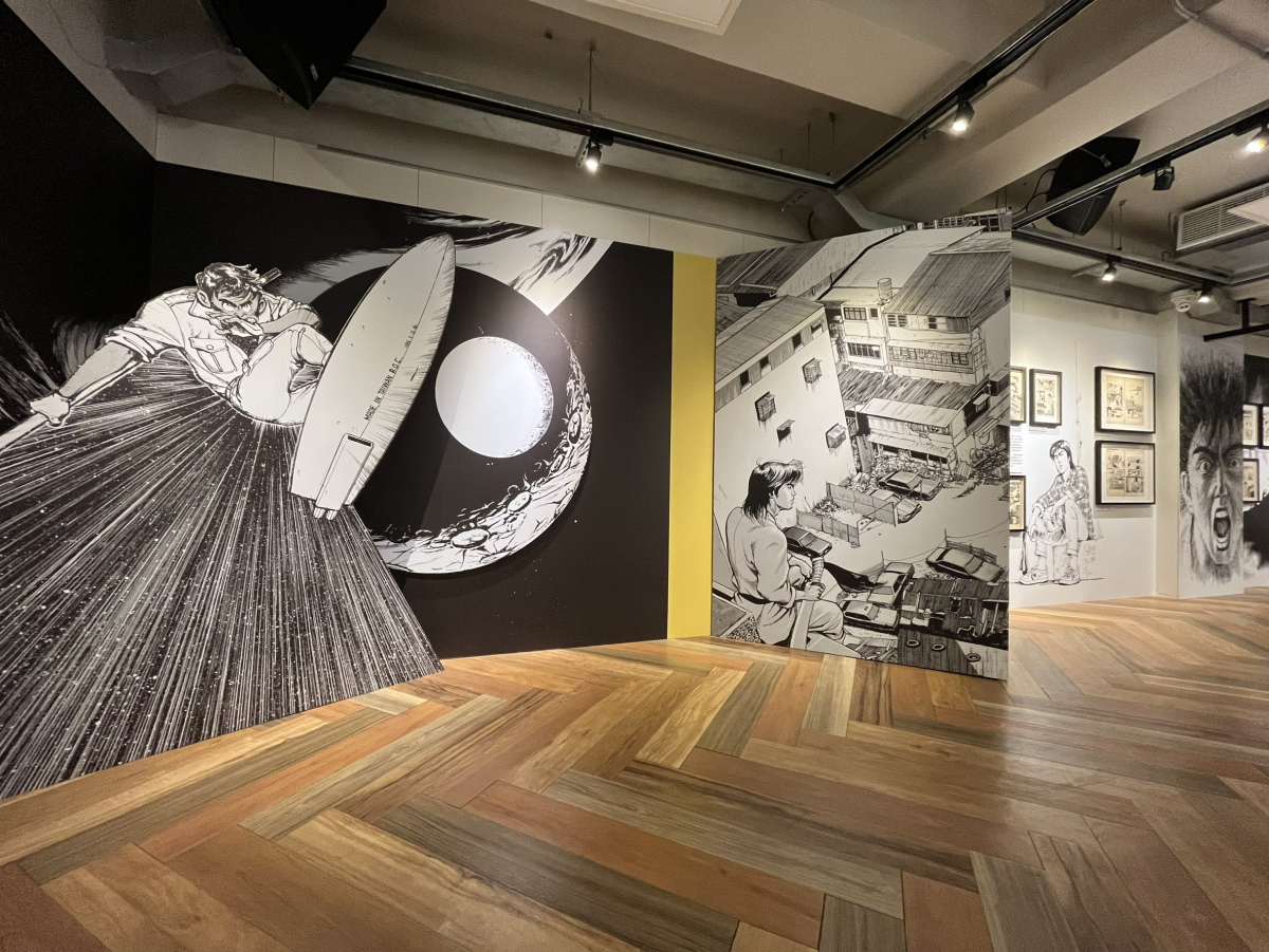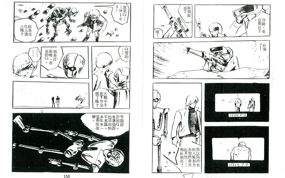 通往展場的階梯右側,展示了1981年,陳弘耀17歲時完成的短篇作品《末日》。從軍方儀表到人機世界,從漸變框格到黑白調度,相較於後來的手筆,這16頁技法嫻熟的科幻故事,顯然不管在造型或表現形式上,都帶有濃厚的日式調性。比較直觀的解釋,是少年不只仰望心儀的作者、作品,更在模仿及內化時嶄露出難得的才華。但事實是,這份心儀指向的,還包括一組自成體系,自終戰以來累積了逾30年的圖像敘事專業。