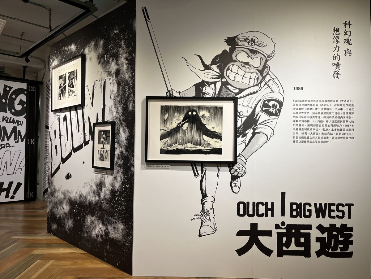 走進展場,與左側創作者年表、生平事蹟對向相望的右側展區,以「科幻魂與想像力噴發」為總述,呈現出1986年發表於《歡樂》漫畫半月刊的《大西遊》。如果不計1983年時,因為兵役問題而只與《百科文化》合作一回的《一刀傳》,這部以星際冒險重構西遊故事的作品,是陳弘耀首次進行長篇連載。