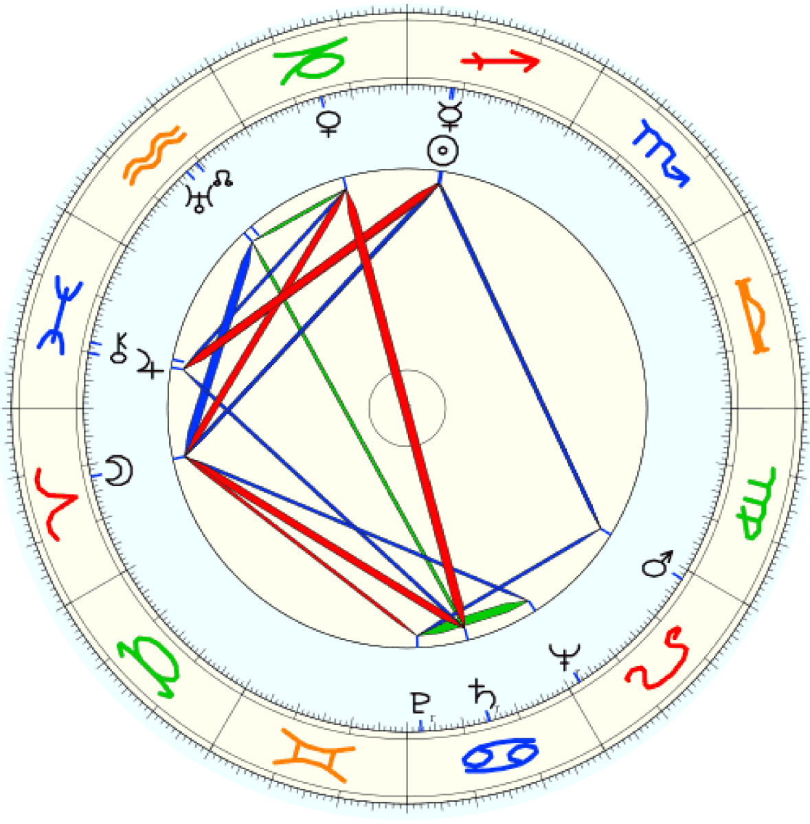 打開鍾理和的星盤,我們首先會看見象徵靈魂意志與人生認同的太陽星座,落於火象星座射手,性格直率,自由奔放的熱情,行動力箭矢般地行疾如飛。太陽旁邊的水星,在占星學裡象徵著信息、溝通與學習的能量,則如希臘神話中的頭戴雙翼帽、手持雙蛇杖、並能隨意出入冥界的眾神信使赫爾墨斯(Hermes) ,行動機敏靈巧,思考狡黠。日水緊密合相於射手,吸附水星色彩的太陽 ,指向的是對於遠大高昂的理想,浩瀚無垠的精神探索特質。
