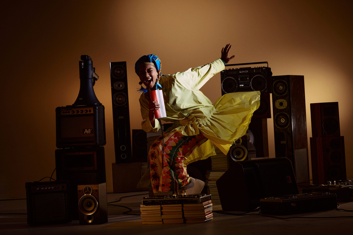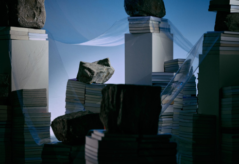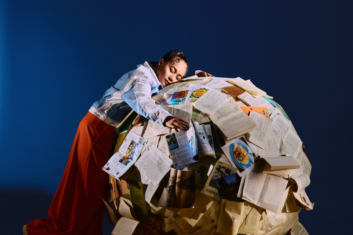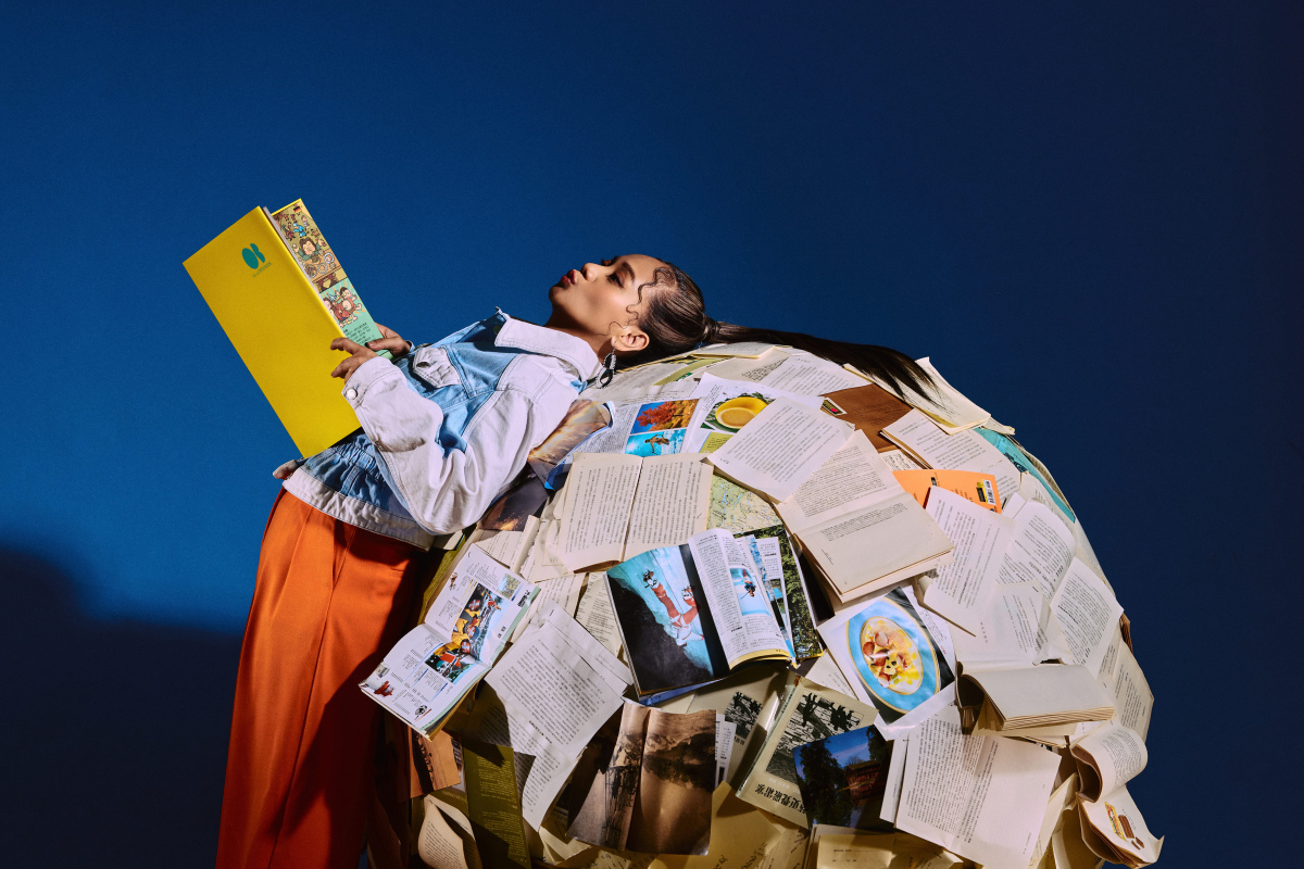 阿爆分享她來自排灣族的經歷,以及開始寫歌、演唱的故事,白輻射就此凝聚成「生活是書」的主軸,書的圖像一下子被不同的空間打開了。山林是書、音樂是書、遊戲也是書,於是攝影棚裡不只有一疊疊的書,還穿插著大石頭、音響,與製作成書球的藝術品,不僅看起來有趣又好玩,也象徵著阿爆的多元身分。