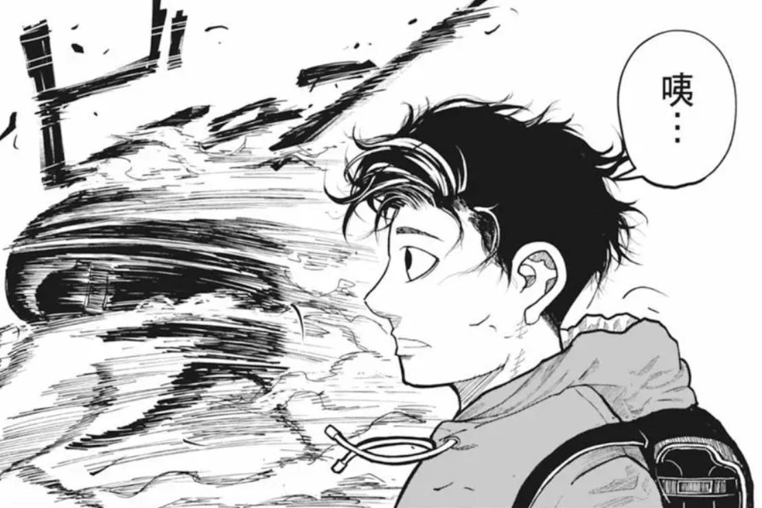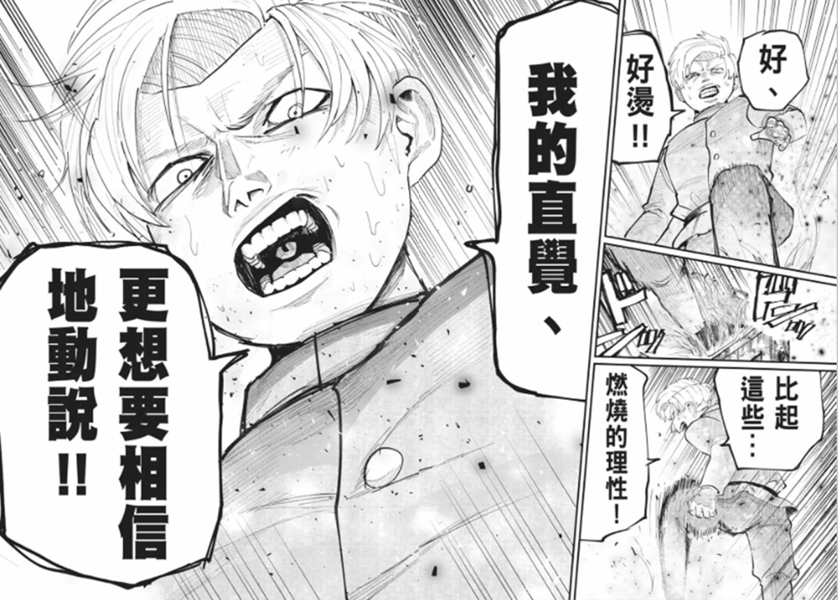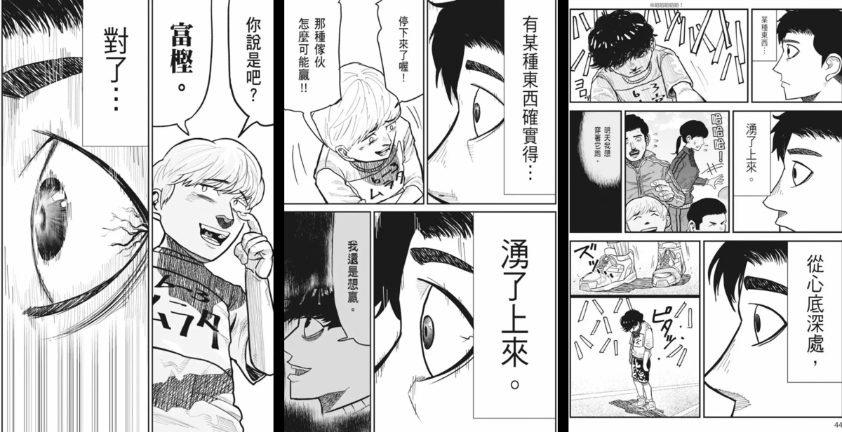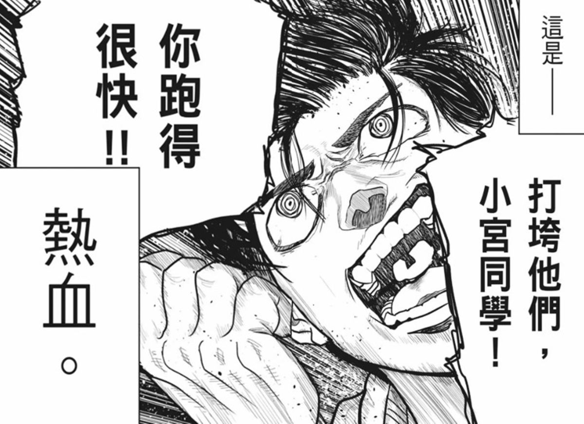 踏步、拔地起跑的瞬間,一股地力湧上軀幹,從胸腔滿溢到口與眼。常識而言,漫畫可以用速度線表現飛奔的瞬間,用透視法營造距離感,但是魚豊的畫面卻常常用眼神表現速度,用眼神決定跑的瞬間。