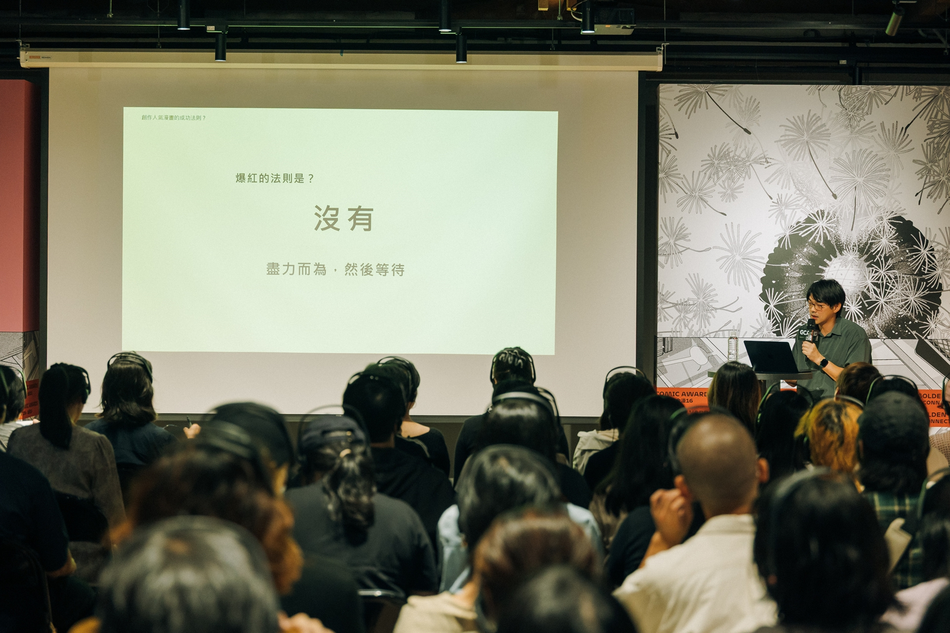 問答環節,被問到對於臺灣漫畫的建議,他認為持續產出更多讓讀者感到有趣的作品,始終還是打入市場最重要的一點。另外,由於漫畫創作過程仰賴讀者回饋,若是難以得到讀者的真實想法,可能代表意見平台不足,也可以嘗試打造相關的評論土壤,豐富整個產業的生態。●