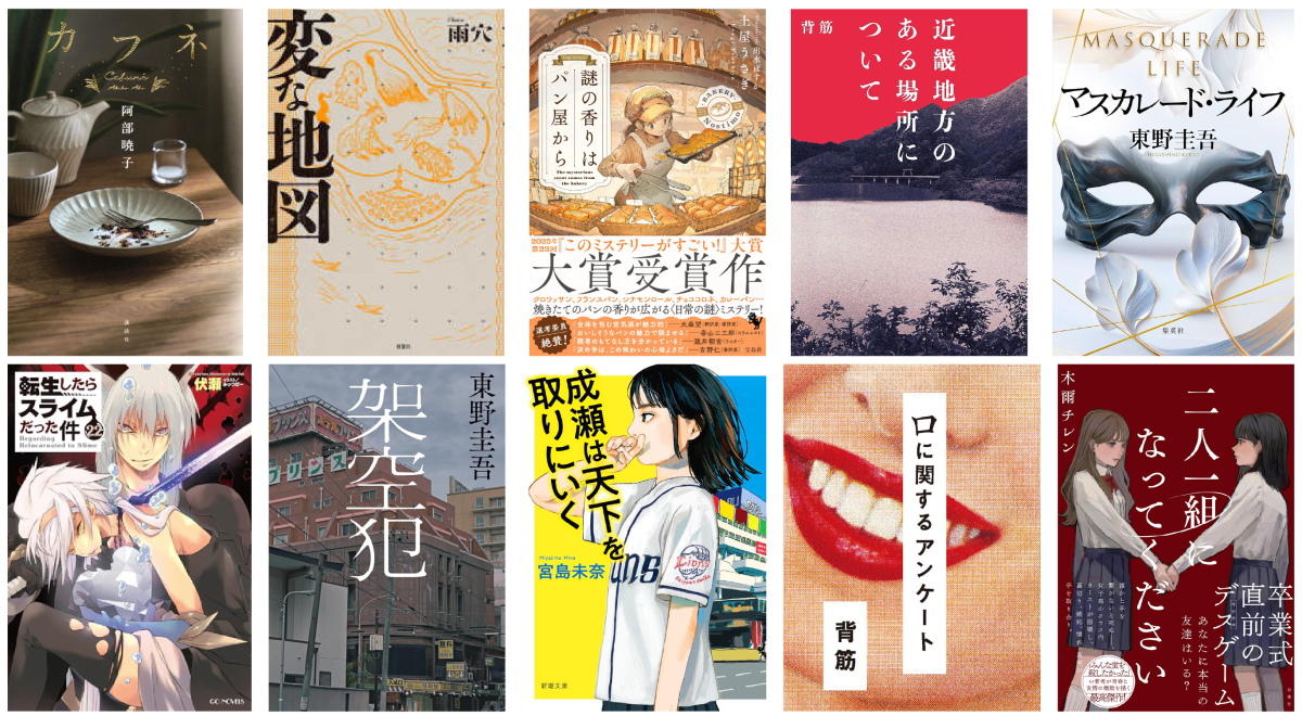 而若單看小說單行本排行,除了擠進總榜前3的《Cafuné》、《詭異地圖》及《來自麵包店的神祕香氣》外,佔據第4-10名的,則是背筋的《發生在近畿某處的那些事》、東野圭吾的《假面人生》、伏瀬《關於我轉生變成史萊姆這檔事22》、東野圭吾《架空犯》、宮島未奈《奪取天下的少女》、背筋《關於口的問卷調查》,以及木爾チレン的《請兩兩一組》。