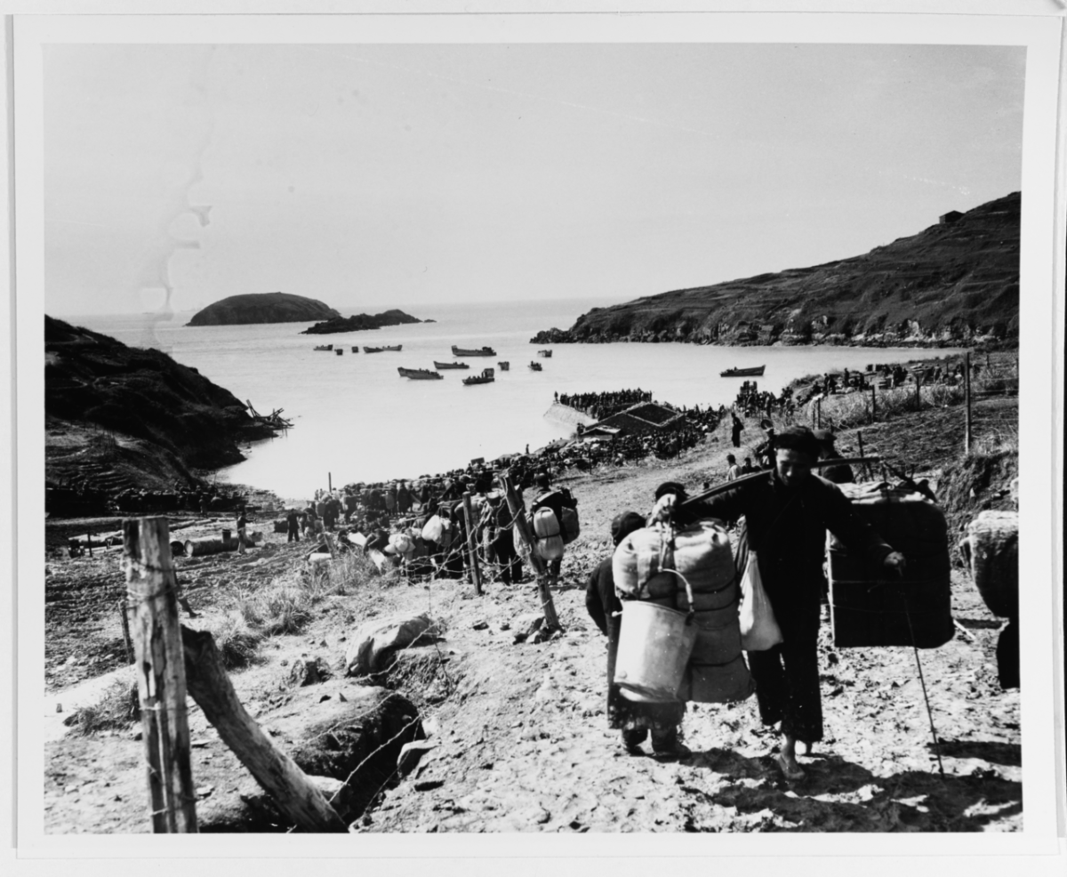 1955年2月大陳島撤退時,軍民在海灘上排隊等候登上美國第七艦隊的船。(圖源:維基)