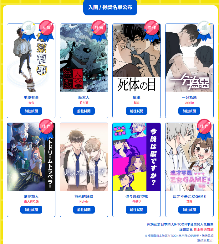 自2014 Line Webtoon在臺灣推出條漫平臺至今超過10年,這項因應手機閱讀世代而生、來自韓國的「新」型態漫畫,商業模式已然漸趨穩定,創作者和讀者之間的供需關係隨之逐一揭示,屬於條漫的文化圈圍起,戰場裡的致勝法則也開始可供檢驗。2025年12月,文策院與日本條漫製作公司Contents Lab. Blue TOKYO(CLBT)、日本樂天集團線上漫畫平臺「R-TOON」三方共同舉辦「2025國際條漫大賽」,選出7部得獎作品,其中3部「銀獎」作品《地獄有事》和《一分為惡》,以及特別評審獎《紙紮人》,將可在臺、日國際出道,上架各大平臺 。