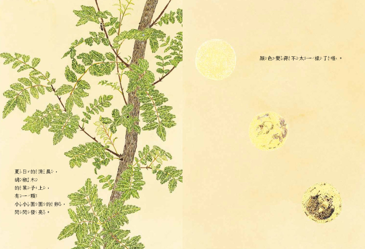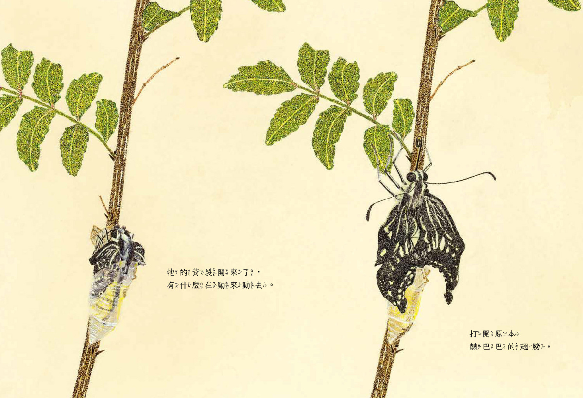 蛻皮,結蛹,羽化,當那彷彿透著薄光的蝶翼最後剎然開展時,相信書前的每一雙眼睛都為之撼動,讚嘆與敬意油然而生。作者用如顯微鏡般的清晰視角,如縮時電影的優美分鏡,淡雅古典的點畫技法,完成了這本猶如藝術品的知識繪本。鵝黃底色氣質沉穩,映襯出所有生命的欣欣變化。就連一株樹莖、一片葉脈,都有著自己的呼吸與姿態。【內容簡介➤】