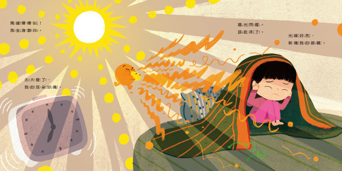 鬧鐘太吵了,陽光太強了,衣服太刺了……作者用強烈的色彩、形狀、線條,把高度敏感孩子每天面對卻難以言說的感官超載感受,具體而體貼地描繪出來。圖像如此清晰有力,讓我們感同身受這群孩子的不得已,並學著使用言語或動作技巧幫助他們避開「地雷」,轉換心情迎向平靜。謝謝這本書站在第一線幫高敏兒發聲,是貼近生活的實用工具書,也是一本溫馨好看的故事書。【內容簡介➤】
