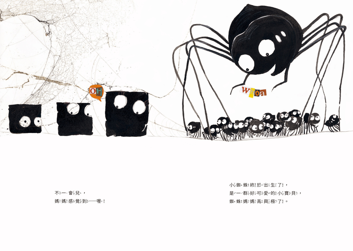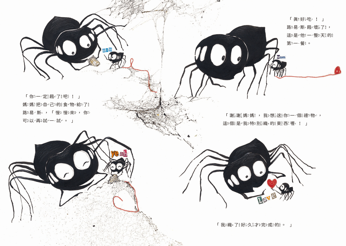 小蜘蛛路易斯跟兄弟姊妹們不一樣,他織出來的網居然是五顏六色的,在一片黑白裡成了最醒目卻又不知所措的存在,昆蟲一看到就避開,根本捕不到食物該怎麼辦?作者利用彩色棉線這個重要媒材來說故事,不僅在畫面上拼貼出繽紛、立體、對比的視覺感受,最後更纏繞再纏繞、變化再變化,迎來意想不道的溫馨結局。圖像一路打著動感節奏,帶領孩子擁抱與眾不同。【內容簡介➤】