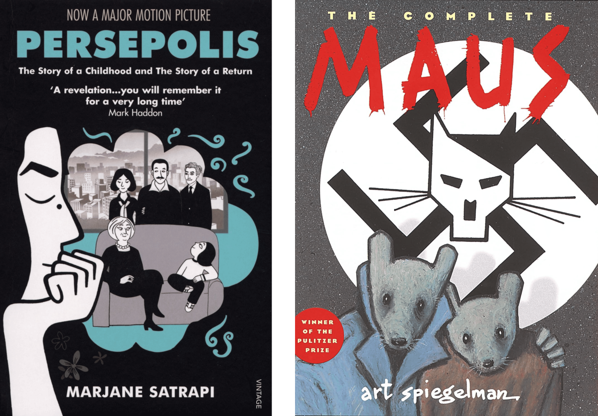 伊朗裔法籍漫畫家瑪嘉·莎塔碧(Marjane Satrapi)的自傳體漫畫《茉莉人生》(左),與美國漫畫家亞特·史畢格曼(Art Spiegelman)用老鼠代表猶太人(猫代表德國人,豬代表波蘭人)述說父母在納粹集中營故事的《鼠族》──後者也是普立茲獎史上首部獲獎的圖像小說。圖片取自網路