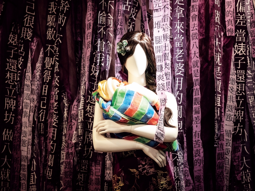 展場一角,她們甚至搬來了鐵皮置物櫃和KTV裡常見的長沙發,椅背上掛著假髮、桌上凌亂擺著喝了一半的手搖和菸灰缸。策展團隊成員在展期間排班,歪斜躺在沙發上滑手機打「傳說對決」。我在展場晃來晃去,就像是穿越到活生生的酒店後台,她們把自己當作展覽的一部份。