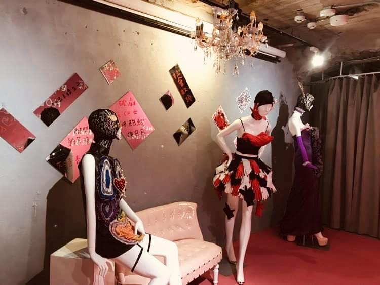 三年多前(2022年),一群性產業工作者在「濕地venue」舉辦了「歡迎光臨,第一天上班嗎?」展覽,位在林森北路的展場展示著她們設計的服裝。珍珠、水鑽、亮片,這些服裝如傍晚後林森北路店家、路邊攤掛起的衣服一樣華麗,只不過包臀小洋裝上貼滿了白色的手,小禮服上面印著骰子的圖案,還有一件開衩長禮服,上面掛滿印著「腿開開賺爽錢」、「沒腦袋沒技術」、「不覺得自己很賤」的布條。