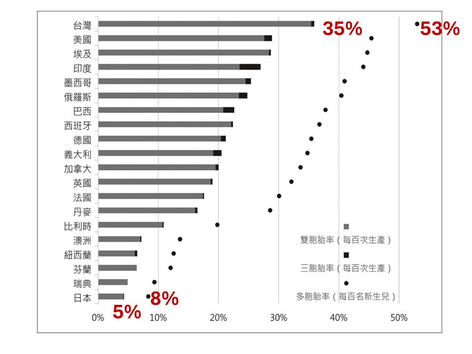 2011年透過體外受精技術而成功懷孕的婦女中,台灣有35%懷的是雙胞胎或三胞胎,生出的試管嬰兒則有53%是多胞胎。日本則是5%孕婦懷雙胞胎或三胞胎,8%嬰兒是多胞胎。(圖表出處:《多胞胎共和國》第43頁)