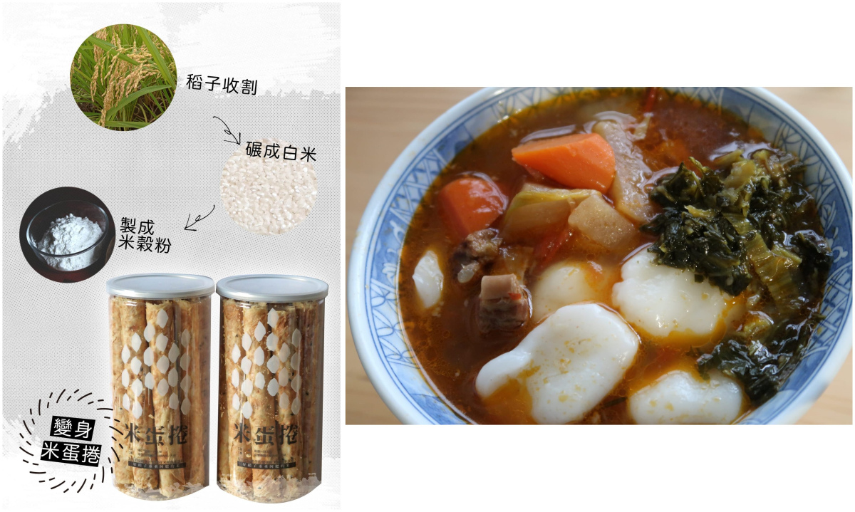 用米穀粉製作的米蛋捲(左)、紅燒米疙瘩(右)。(徐苑斐提供)
