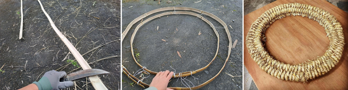 由左至右:剖竹片、修整。烤竹成環狀。纏繞稻草、完成鼎圍(徐苑斐提供)