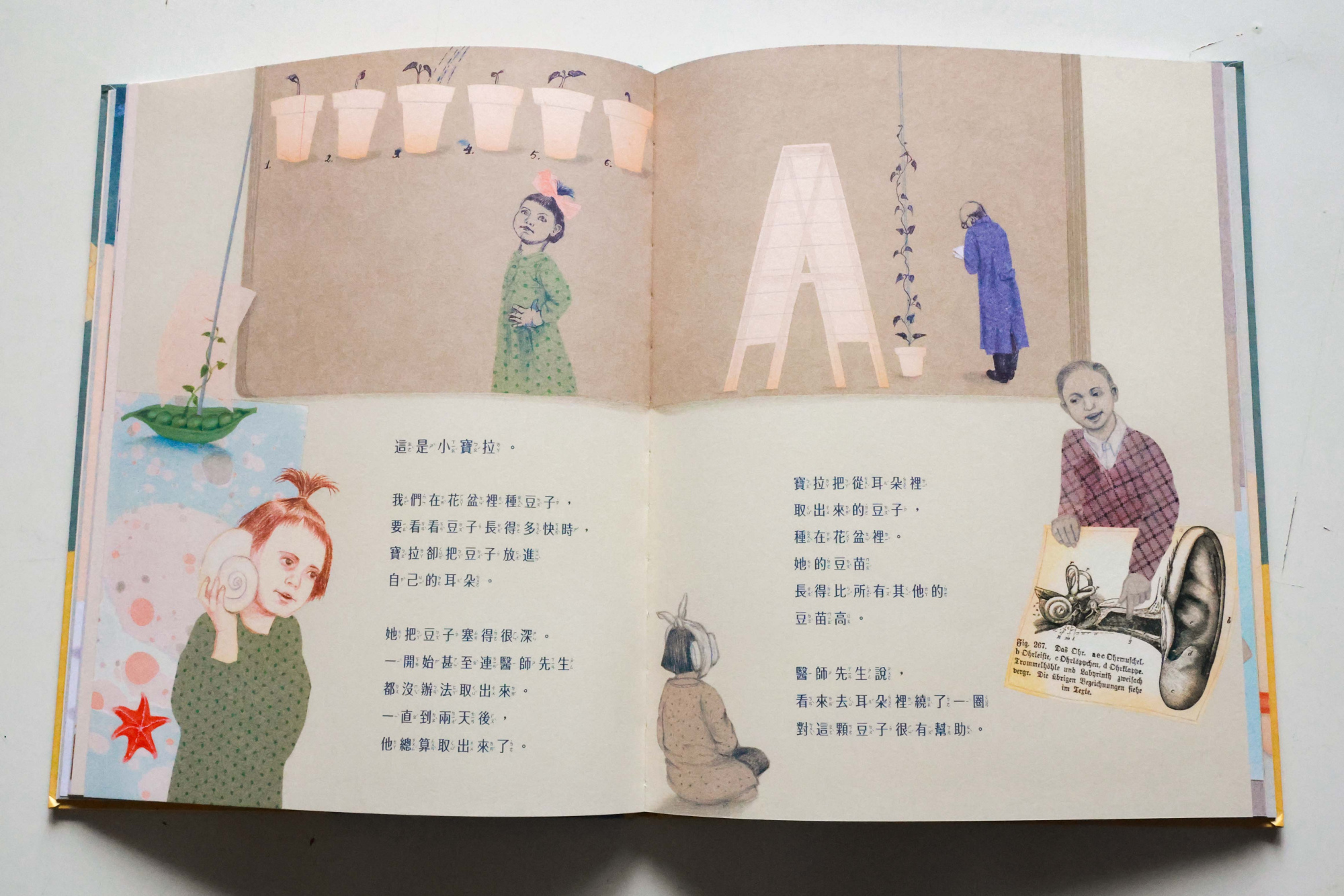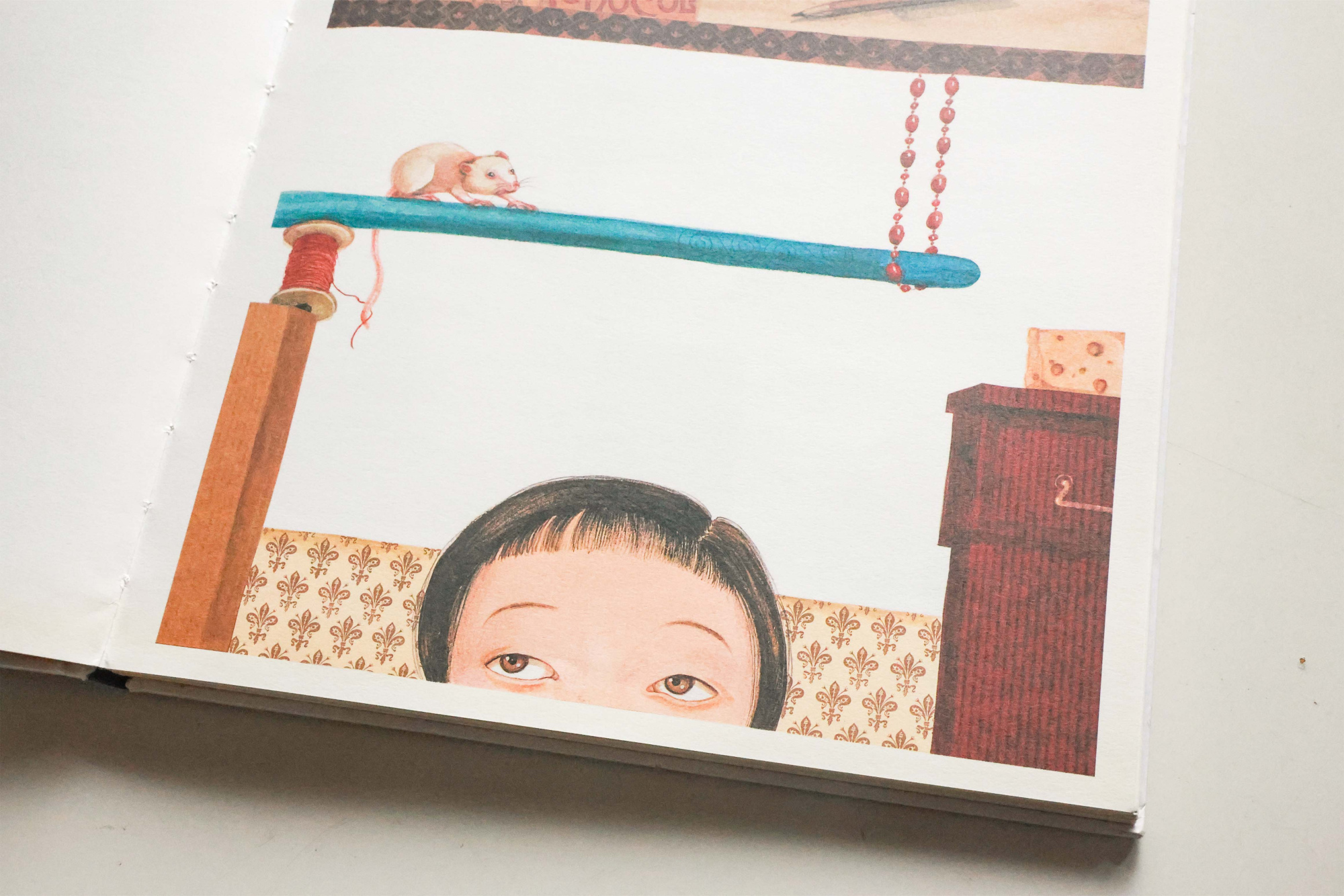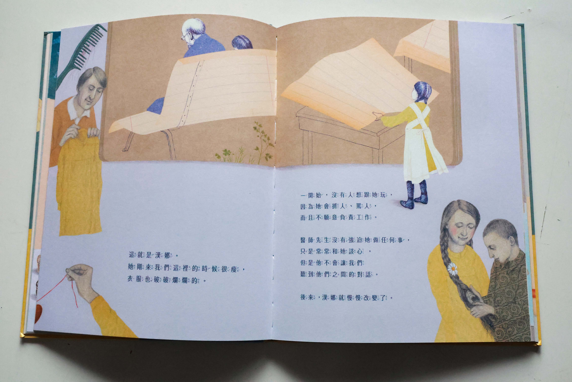 「編織」在各種文化中,經常與女性緊密相連,齊米雷斯卡在書中重新組合實際的布料、刺繡和鈕扣,將舊物與舊照片為經絲和緯紗,揉合她溫柔而克制的筆觸,為平凡、弱勢的女性發聲。這是屬於圖畫書藝術家獨特的編織技藝。
