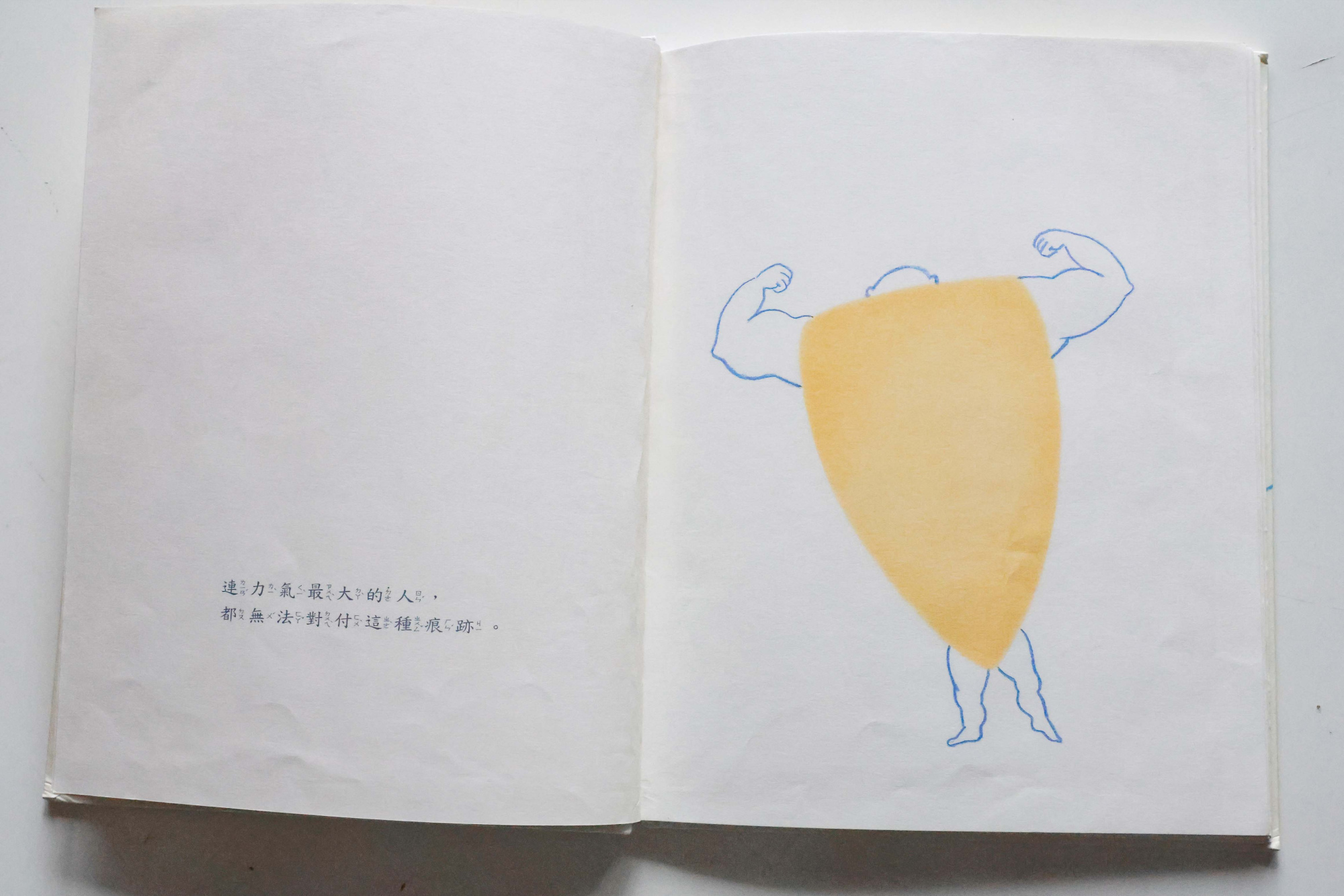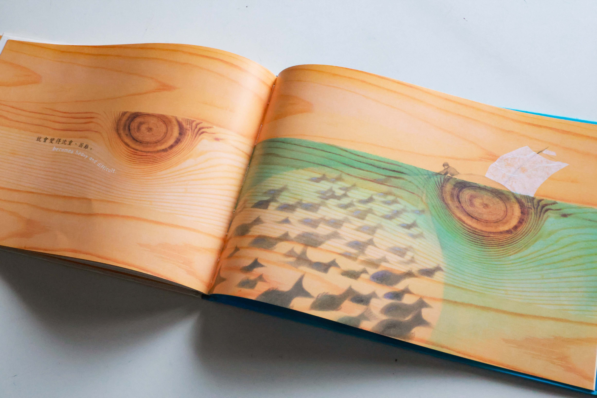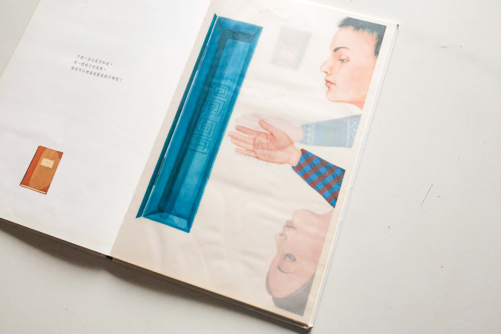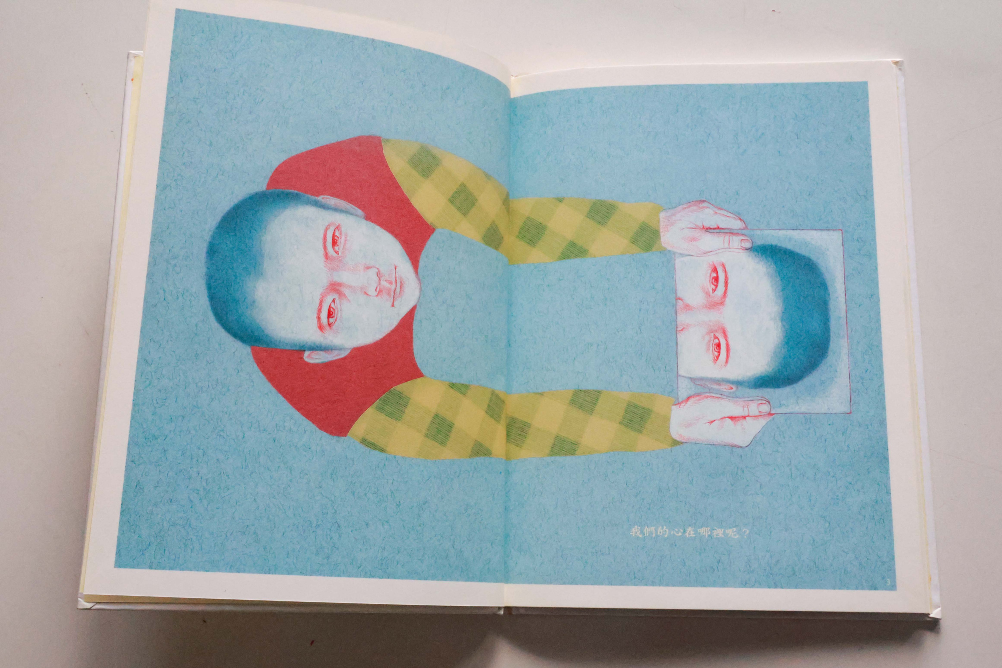 另外,齊米雷斯卡不迴避圖畫的中軸線,反而大膽善用,隨著翻動書頁,畫中平面的物件似乎動了起來。在故事的最後一頁,她加上燙銀設計,藉著鏡面的反光,映照出韓文「心」的讀音「Maum」,讀者在經歷心的探索歷程後,最終回歸本心,形式和內容完美的結合,完成了這本純淨又與眾不同的書。