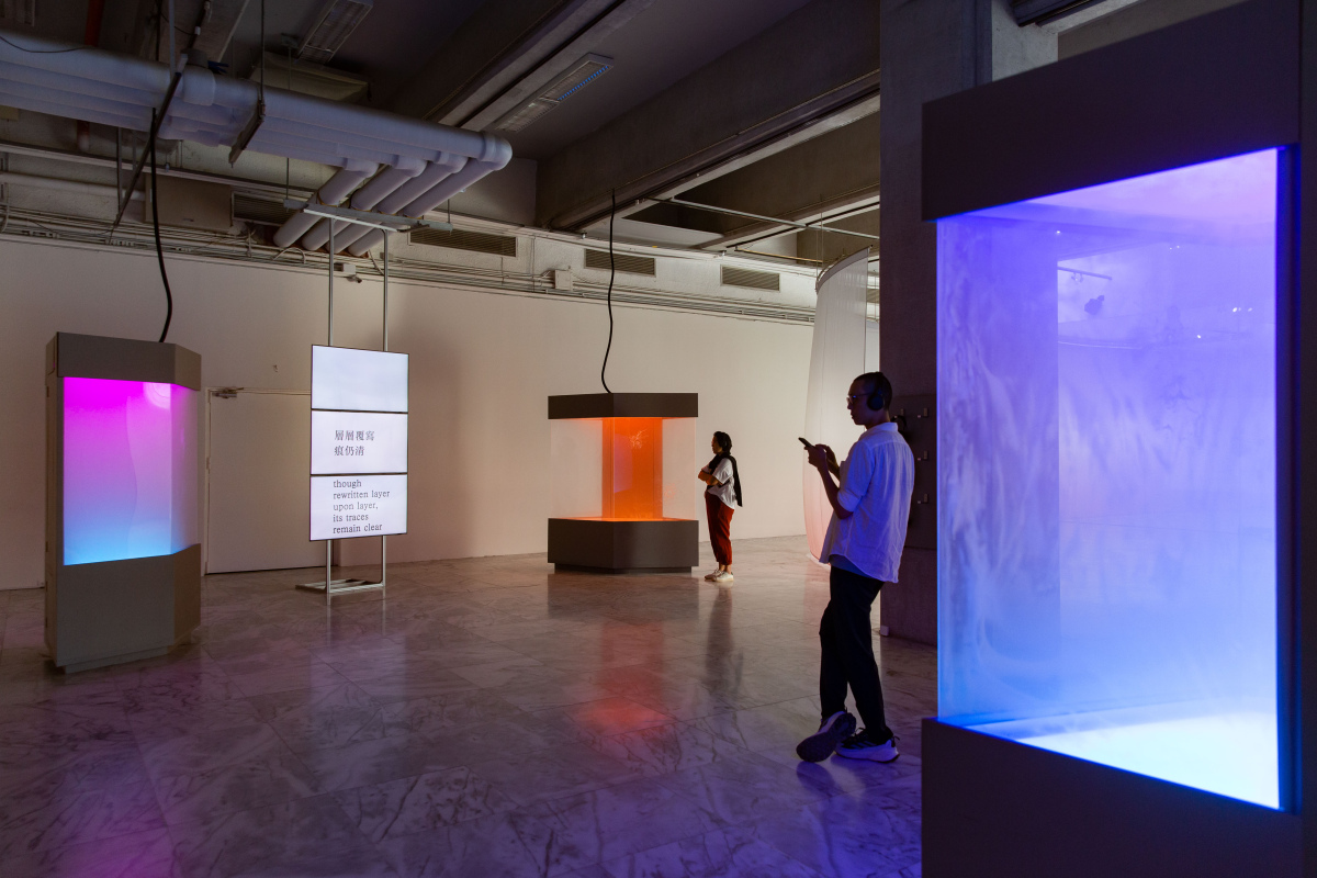 致穎,《再鑄》,2025,同步音訊、三組受損展示櫃、LED 燈具與煙霧機、三幅附框素描,每幅 42 × 42 公分,尺寸依空間而定,藝術家版權所有,由 2025 台北雙年展委託製作。(臺北市立美術館提供)