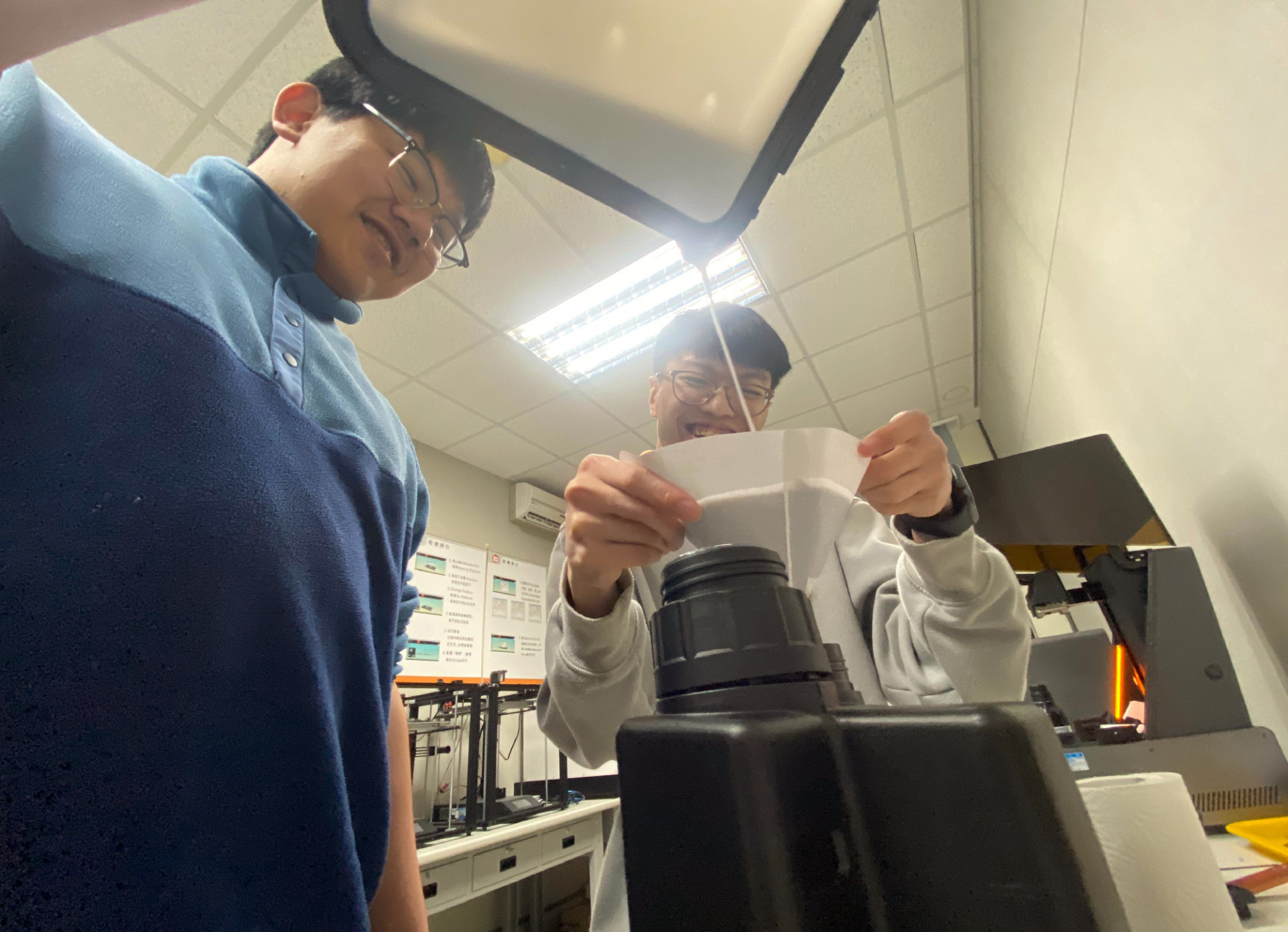 華梵同學製作光固化3D列印「空中小人」,左起黃馳勝、陳羽翔