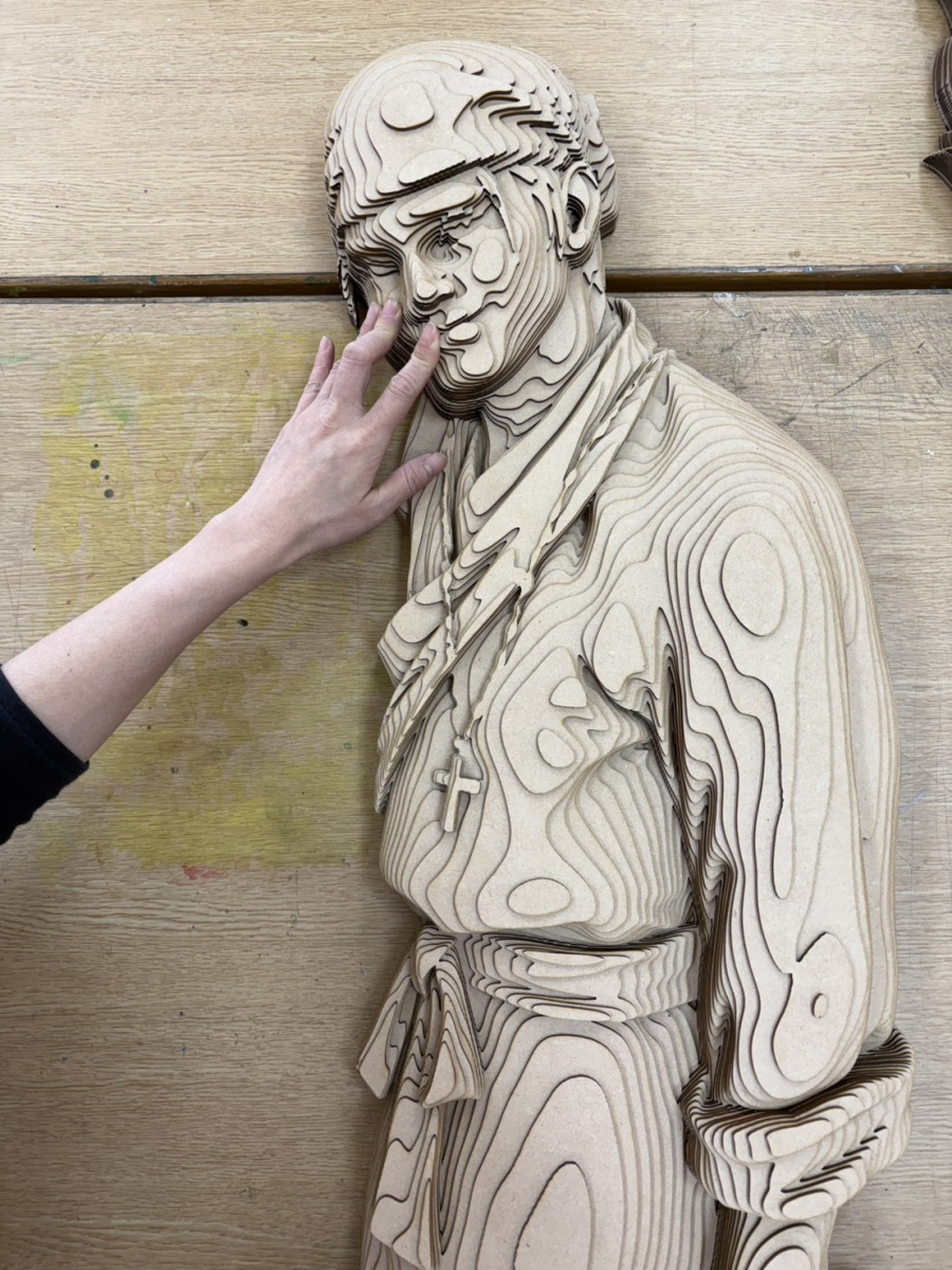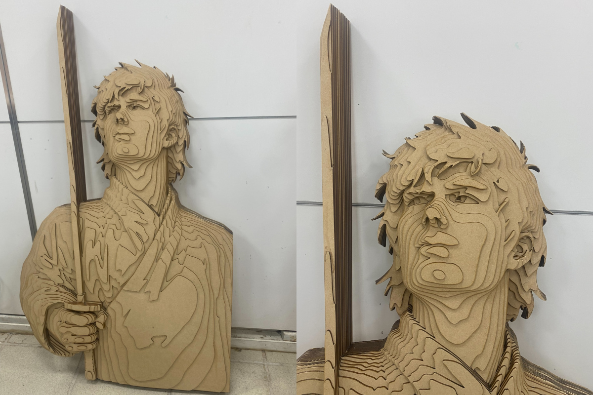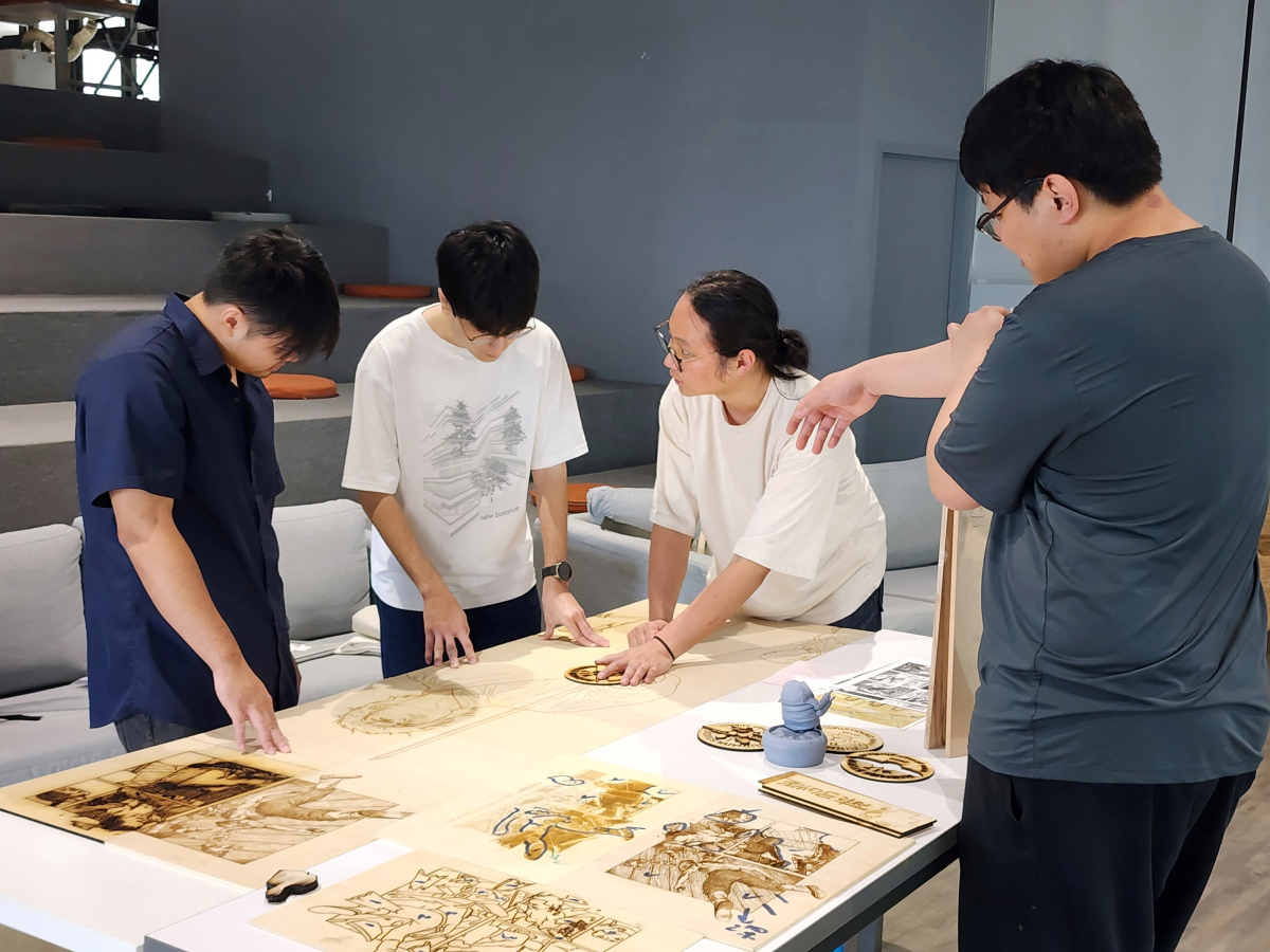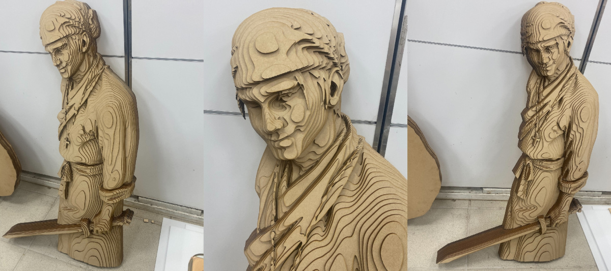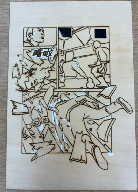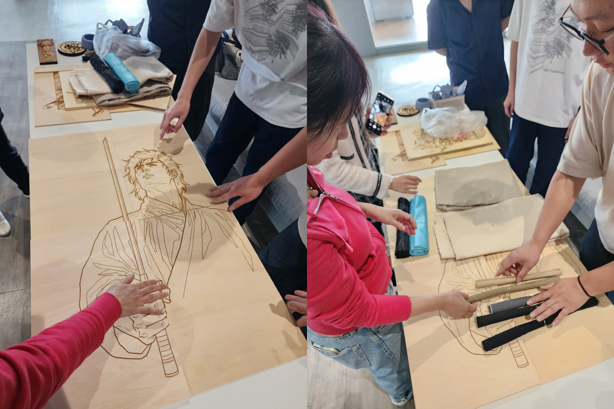 構圖版在反覆修正與思考後,決定用像是地圖上「等高線」般的方式來堆疊,避免擬真的立體浮雕反而導致失去漫畫「平面」的況味,再利用木材表面的不同研磨程度區分角色人體與衣飾,讓視障者能透過立體空間的相對位置,在腦中描繪出漫畫家的畫面營造。材質版類似於在畫面上覆蓋對應的材料,視障者摸得到大俠的布料和皮膚──放心,貼的是豬皮──得以符號性地更加理解漫畫家繪製的筆觸。