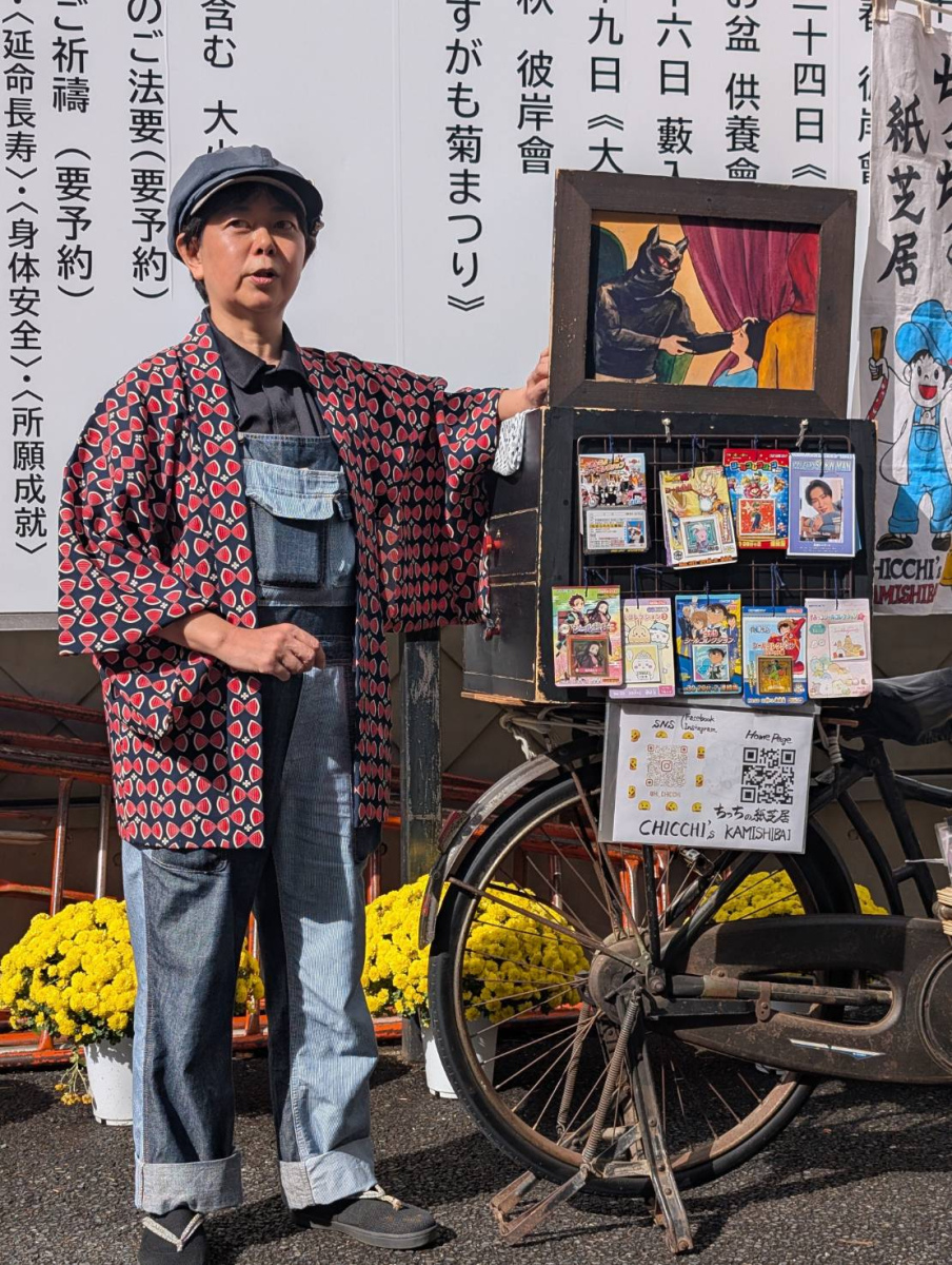 近年以一部搭載簡易箱型舞台的腳踏車活躍於東京街頭,為人們講述各種奇想故事的紙芝居師ちっち(IG@ hi_chicchi)。圖片提供/唐墨
