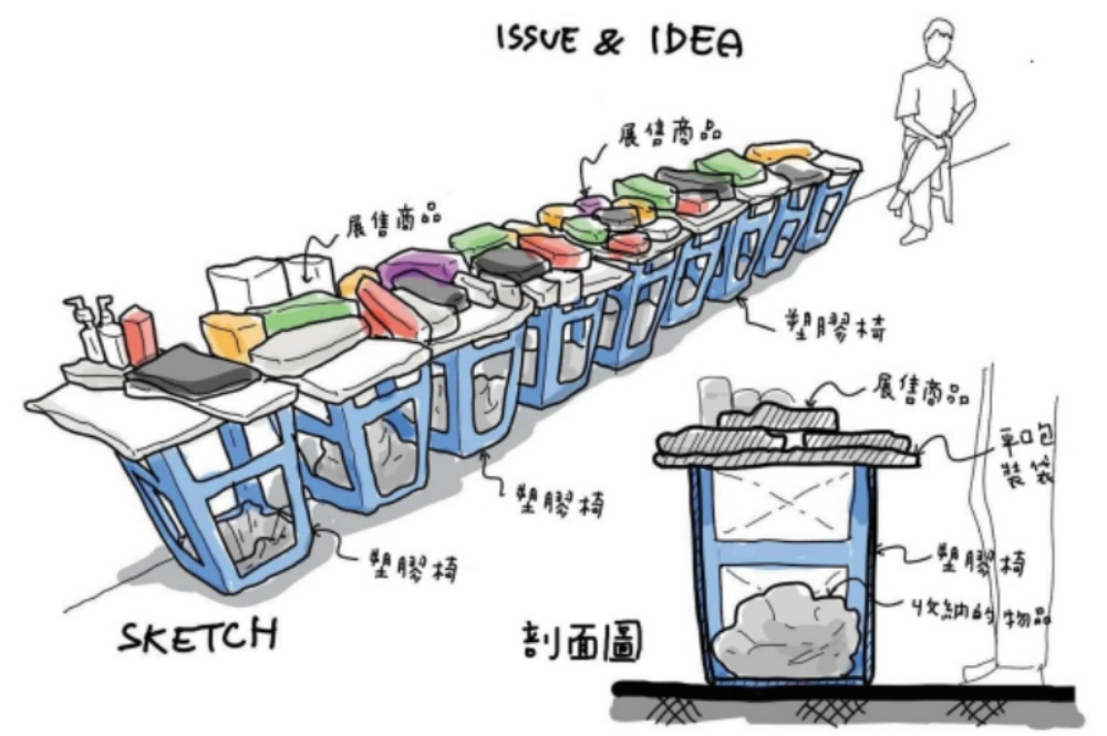 泰國街頭用生活物件佔領空間(左),臺北市場用板凳搭出展示台(右)