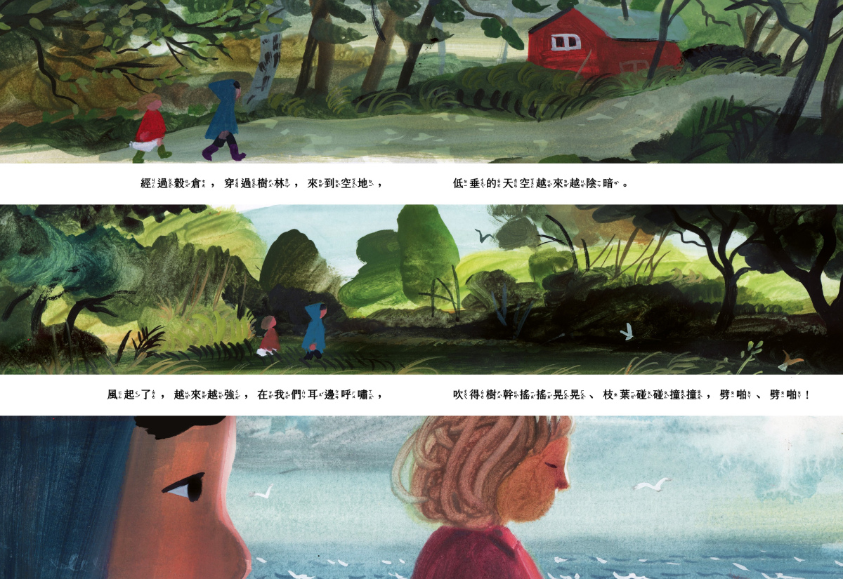 風的狂放顫抖,雨的淋灑濕潤,彷彿都從紙頁滲出來了。讀著這本書的人此刻都成為逐風者,跟著書中的小兄妹,跟著席尼.史密斯充滿聲響、溫度與情感的畫筆,一起往暴風雨的中心跑去。飽滿的光影處理及精準的畫面節奏,讓這場小島冒險從頭到尾充滿追逐快感與生命活力。全身濕透的彷彿是讀者自己,瑰麗的、陰沉的、期待的、畏懼的都近在眼前。越是趨身靠近,越是氣喘吁吁,兩隻小手更要牽得緊,最後一起奔回母親懷裡,在消散的風雨中感受那股童年才有的衝動與感動。【內容簡介➤】
