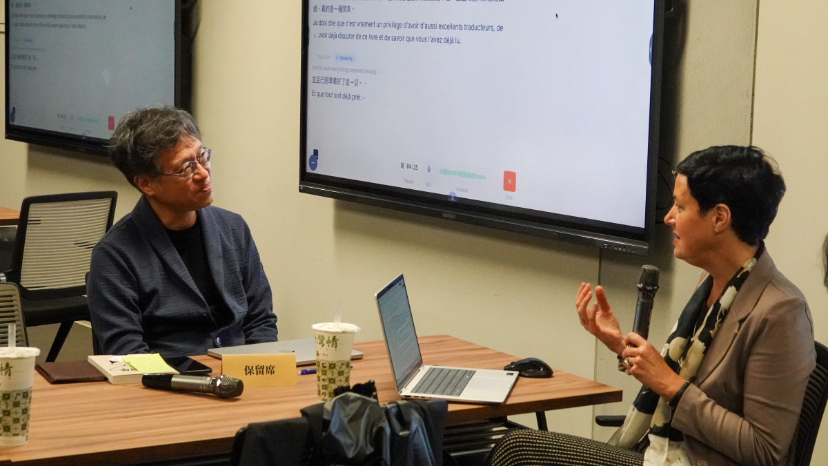 工作坊下半場,進入開放自由交流的時段,主持人蘇碩斌首先感謝讀書會提問的深度,同時也感謝夏苾洛回答得輕鬆自如。為了呼應《文學社會學》書中對於「英語霸權」的反省,臺大臺文所特別安裝了一套即時AI翻譯系統,問答者對著麥克風講的話,可直接在螢幕呈現華文、英文、法文三國字幕。現場眾人可逕以母語發言,不一定需要透過英語中介。