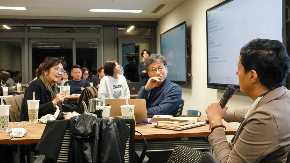 臺灣文學與文化研究學者張誦聖(左)、蘇碩斌及夏苾洛在工作坊現場交流(國立臺灣大學臺灣文學研究所提供)